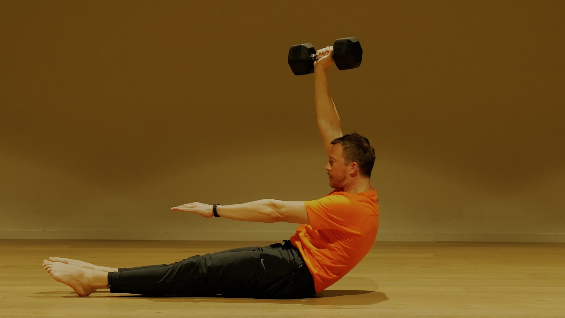 🏁 Begin in a seated position, holding a dumbbell overhead with one arm