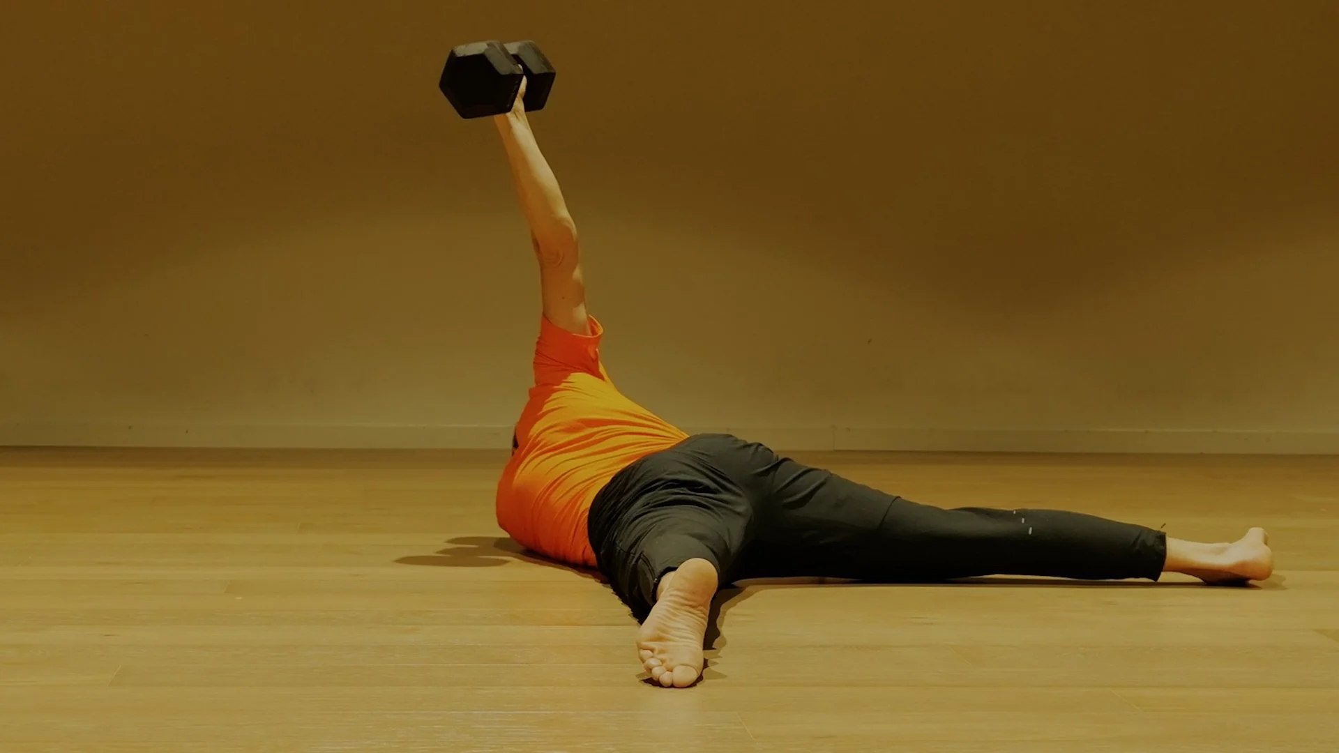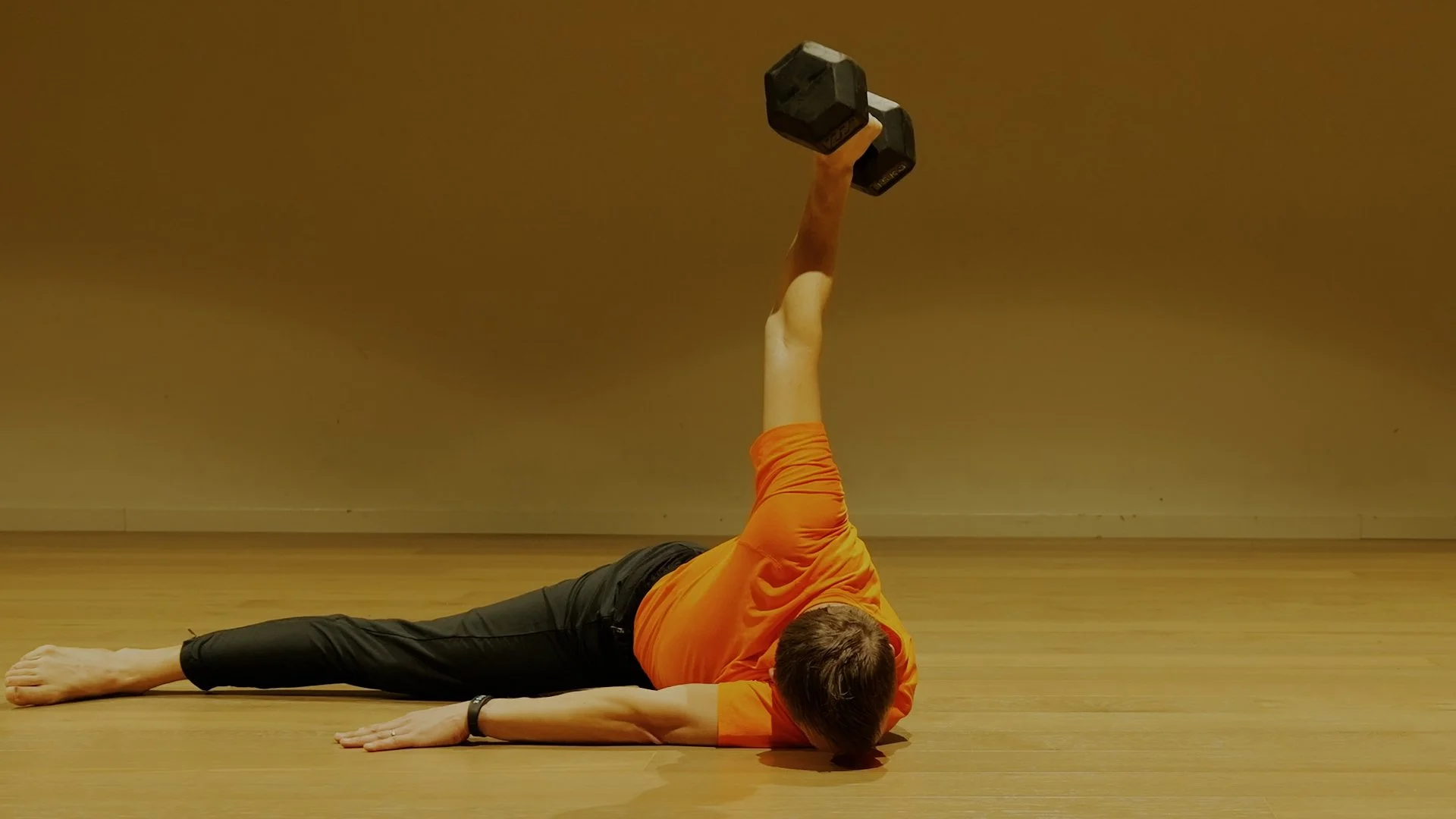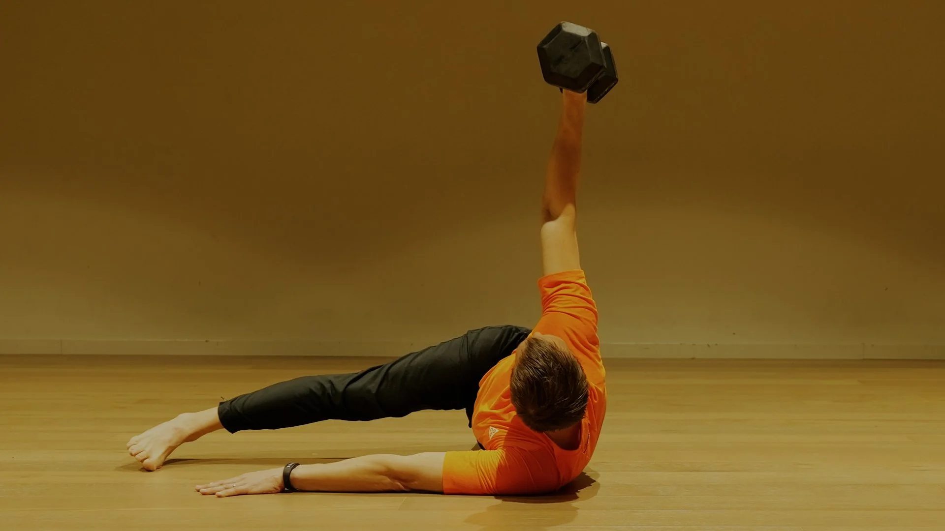 Push into the supported arm on the ground, elevate the opposite shoulder, and roll off the head. Maintain the loaded shoulder vertically aligned and extend the arm towards the ceiling. Gaze towards the dumbbell.