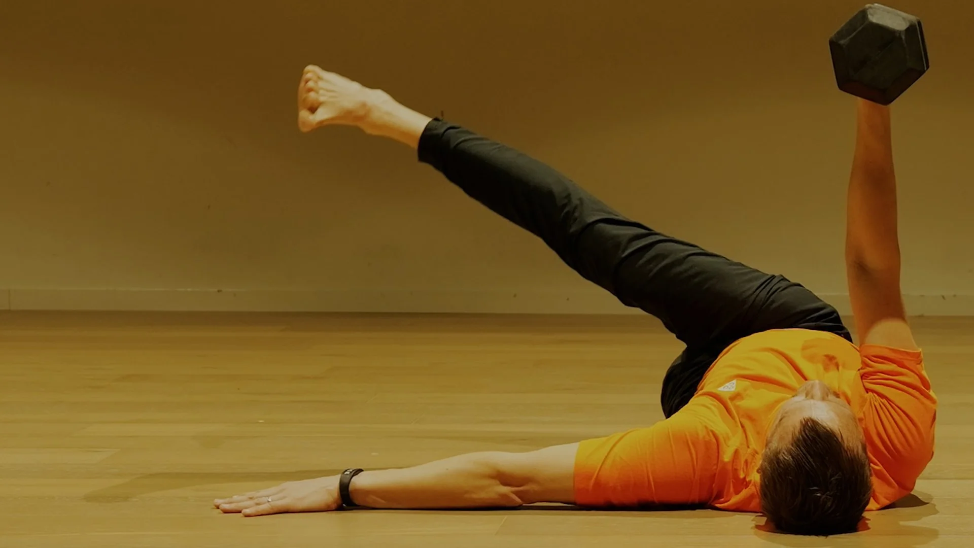 Elevate the leg into hip flexion (on the same side as the arm holding the dumbbell), keeping the foot in dorsiflexion and the knee extended.
